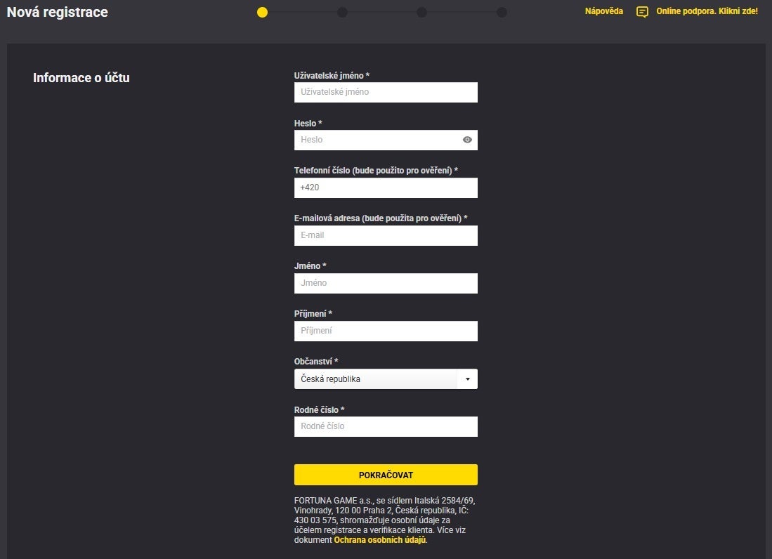 Registrace je jednoduchá – stačí vyplnit osobní údaje, zvolit uživatelské jméno a heslo, souhlasit s podmínkami a ověřit účet e-mailem nebo SMS.